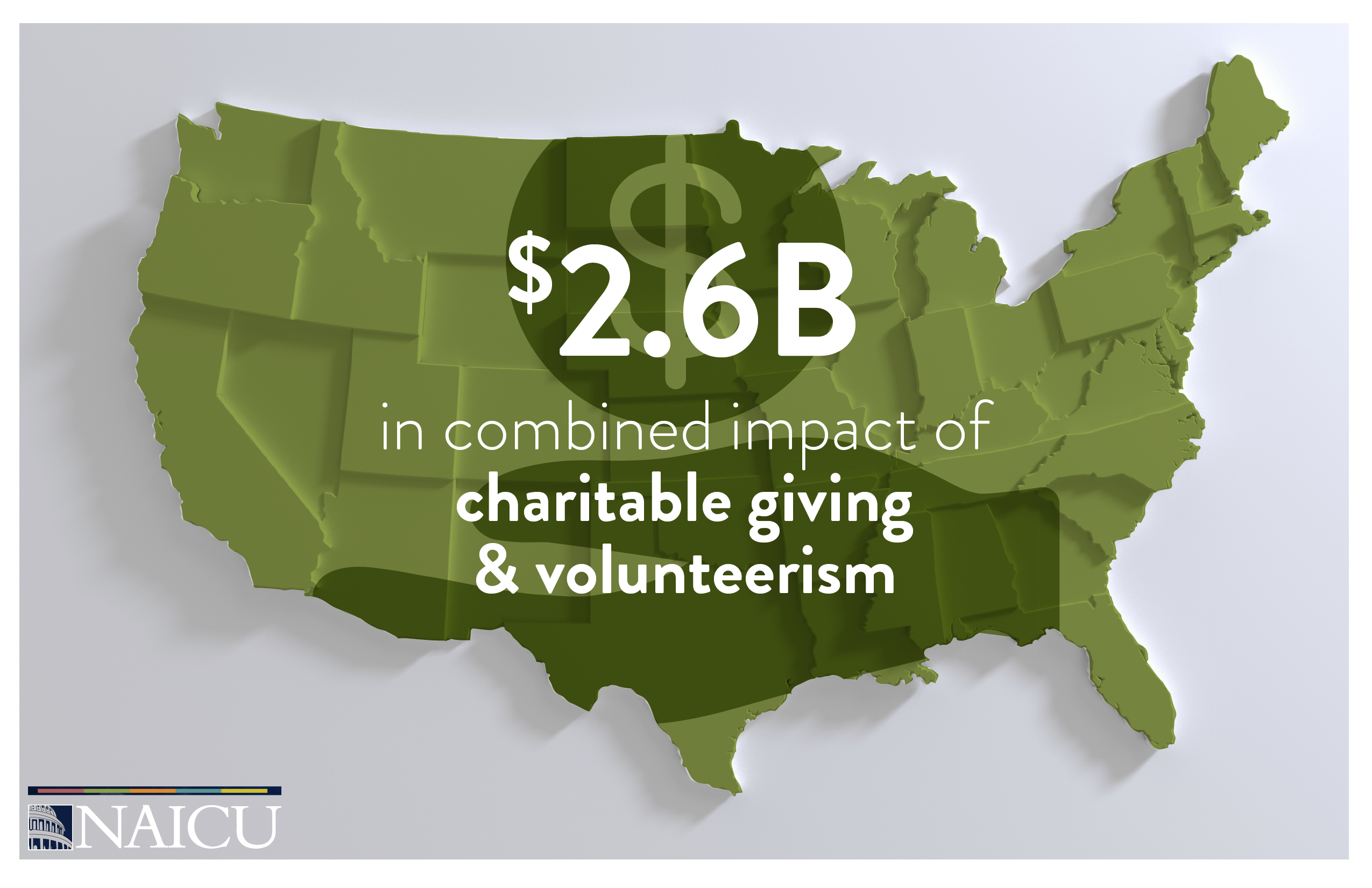 Communities throughout the country benefit from the volunteer and philanthropic spirit embodied at many private, nonprofit colleges and universities. This spirit of giving back is rooted in the founding missions of these institutions. In 2024, the combined impact of charitable giving and volunteerism totaled $2.6 billion.